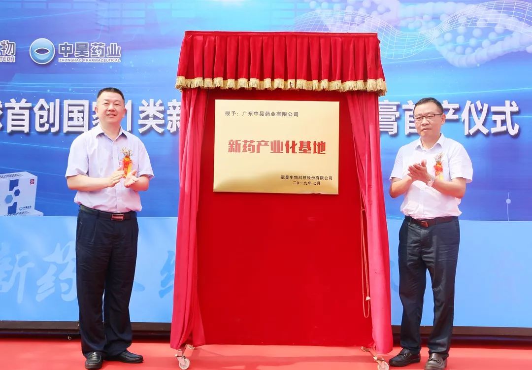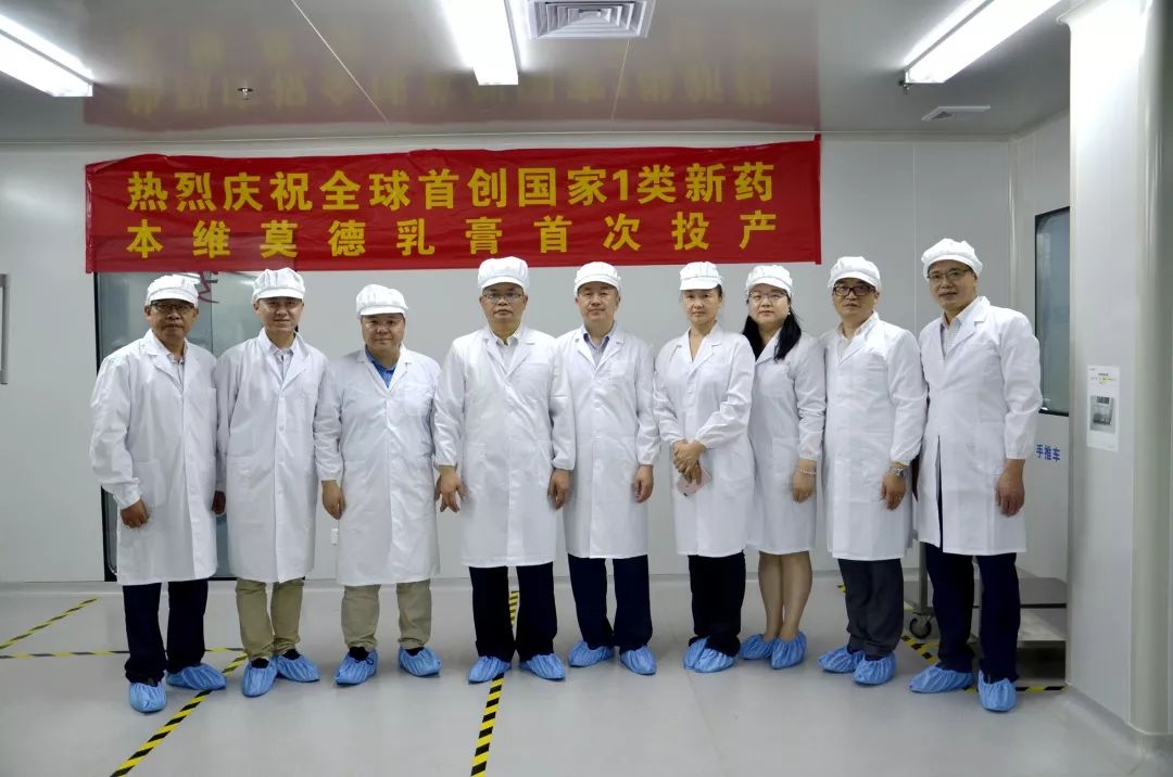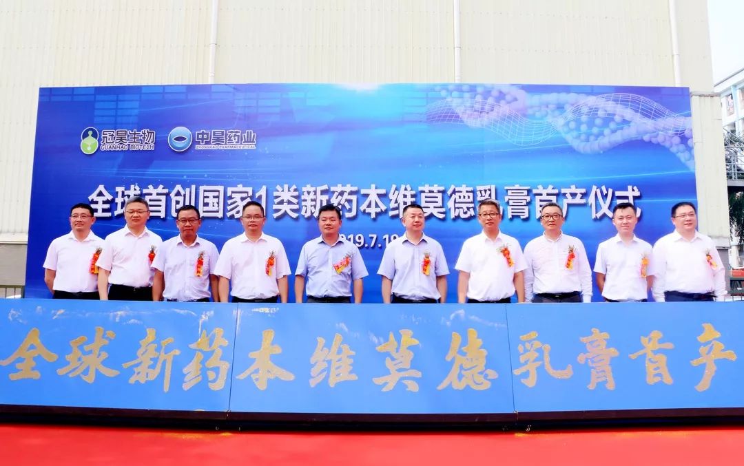 2019年7月19日上午,“全球首創國家1類新藥本維莫德乳膏首產”儀式在國家健康基地園區企業——廣東中昊藥業有限公司(以下簡稱“中昊藥業”)隆重舉行,這標志著我國建國70年來第一個皮膚領域first-in-class的化學創新藥投產上市!