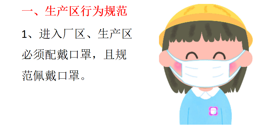 據公司生產技術部負責人羅麗敏介紹,這份疫情防控行為規范分為生產區行為規范、生產區清潔規范、就餐行為規范、生活區注意事項、洗手及佩戴口罩方法六大防疫防控重點,每一項均有具體的操作細則,及示意圖。