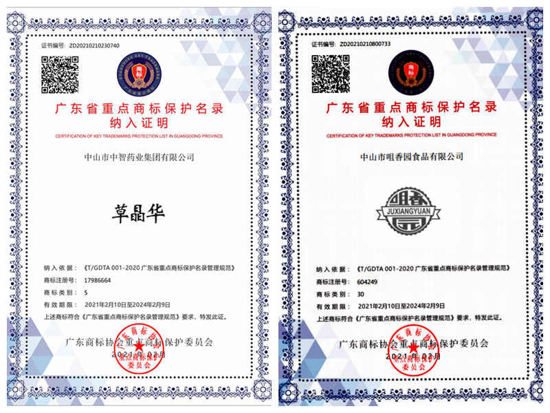 近日,廣東商標協會公布了廣東省重點商標保護名錄,健康基地集團園區企業中山市中智藥業集團有限公司的“草晶華”商標、中山咀香園食品有限公司的“咀香園”商標脫穎而出,被納入保護名錄。