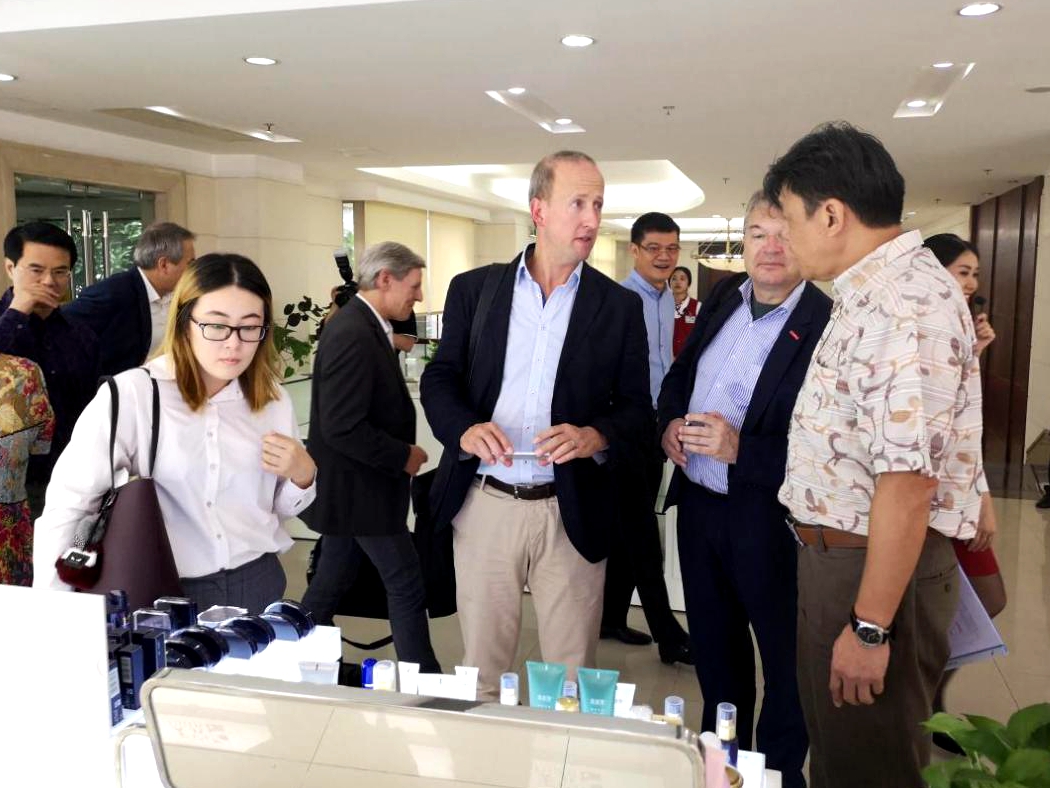 下午,考察團一行來到完美(中國)有限公司總部進行參觀,并就新技術合作項目與代表團進行座談交流。完美公司董事長古潤金,總裁胡瑞連等參加了活動。
