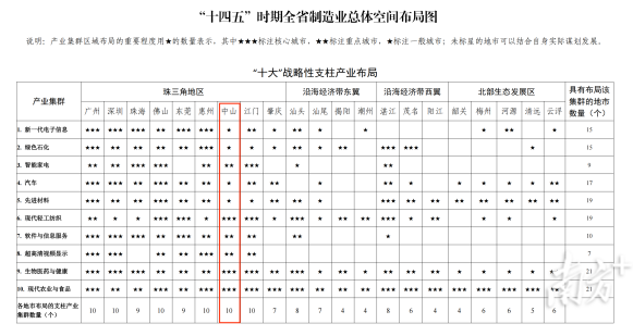 《規(guī)劃》中,共有68處內容直接提及中山。在“十大”戰(zhàn)略性支柱產(chǎn)業(yè)布局和“十大”戰(zhàn)略性新興產(chǎn)業(yè)布局中,有19個產(chǎn)業(yè)將中山作為布局城市。其中,現(xiàn)代輕工紡織、生物醫(yī)藥與健康、現(xiàn)代農業(yè)與食品3個產(chǎn)業(yè)將中山列為核心布局城市。
