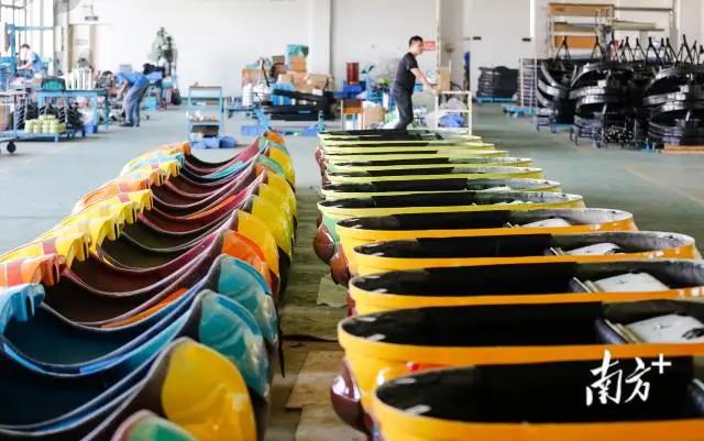 金馬游樂港口鎮廠區的生產車間內,一些制作完成的碰碰車外殼碼放整齊,等待出庫。