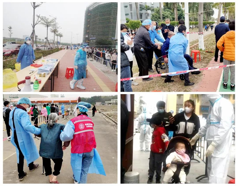 健康基地集團全員下沉一線,并匯聚了園區中智藥業、安士制藥、康晟生物、理科蟲草、華實照明、領先展示、樂心醫療、武藏精密、美捷時、天鍵電聲、九州通、聯洋科技等企業志愿者,為核酸篩查工作提供堅強的人力支撐和組織保障。全面落實服務隊的防護物資、標本管理、后勤保障等工作,做好堅實后盾。此外,為行動不便人員、老人、兒童、孕婦等特殊人群設立暖心“綠色通道”,通過協助掃碼登記指導完善信息,縮短逗留時間。遇上行動不便的群眾,工作人員會上前攙扶他們進場,提供全流程對接服務。