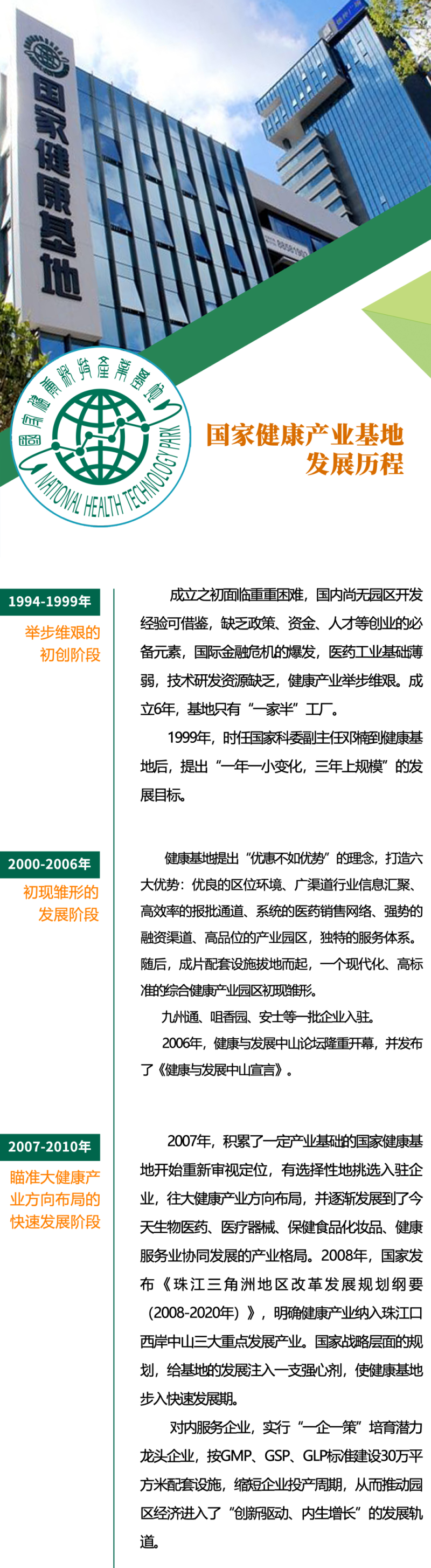 1992年1月,中美兩國在華盛頓聯合簽署了《關于知識產權保護的諒解備忘錄》。國際環境的變化,要求中國必須擁有具有自主知識產權的創新藥物,否則必將在未來的經濟角力中吃虧。而這也同時意味著,在中國建設一個按照國際創新藥物標準的新藥研究、開發和生產基地,顯得迫切而重要。有山有水有碼頭、離港澳近的中山贏得了這次機會。1994年,時任國家科技部副部長鄧楠、廣東省副省長盧鐘鶴、中山市市長湯炳權分別代表國家科委、廣東省人民政府和中山市人民政府,在中山正式簽署協議,由三方共建當時國內唯一的國家級健康科技產業基地,這標志著中國的自主新藥研發和產業化從此在健康基地邁入征途。