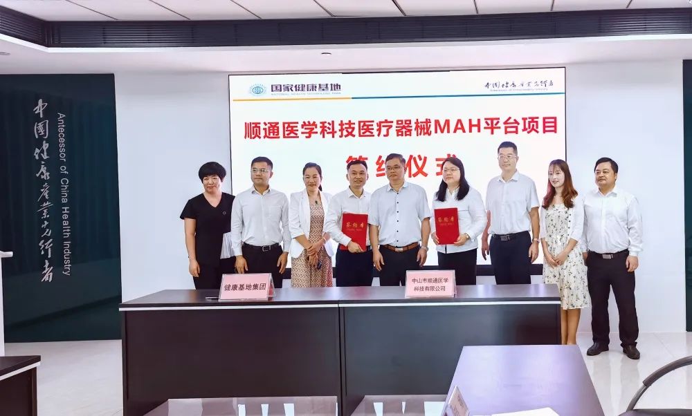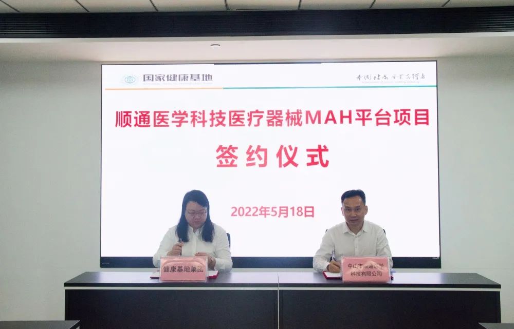5月18日,中山市順通醫(yī)學科技有限公司醫(yī)療器械MAH持證平臺項目簽約落戶健康基地。中山港街道黨工委副書記徐世平、健康基地總經(jīng)理萬鶴群、中山市順通醫(yī)學科技有限公司(下稱“順通醫(yī)學公司”)總經(jīng)理云惟鈺等出席簽約儀式。