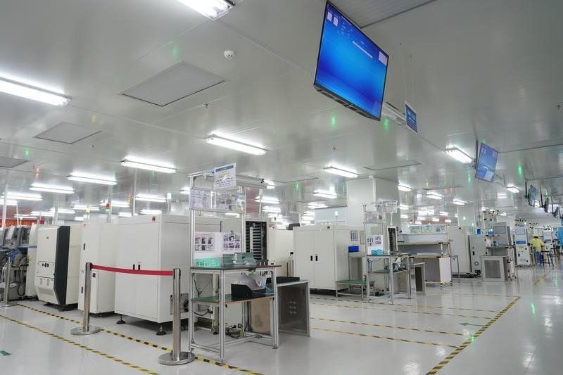 血壓計(jì)是樂心醫(yī)療的主打產(chǎn)品,在三樓隔著玻璃窗觀察車間,智能化的生產(chǎn)線正在高速運(yùn)轉(zhuǎn),工人們?cè)诟髯詬徫簧鲜炀毜夭僮鲀x器,組裝零部件。在二樓SMT智能生產(chǎn)車間,自動(dòng)化設(shè)備占比高達(dá)90%以上,每條生產(chǎn)線的工人寥寥無幾,數(shù)控大屏上正滾動(dòng)著多項(xiàng)實(shí)時(shí)生產(chǎn)數(shù)據(jù),讓生產(chǎn)進(jìn)度和狀態(tài)更加清晰。連接各樓層的智能立體倉(cāng)庫,穿梭車?yán)锰嵘桨搴投ㄎ粋鞲衅鳎刂浖軆?nèi)的軌道運(yùn)行,快速、精準(zhǔn)地把貨物轉(zhuǎn)運(yùn)到指定位置,從而節(jié)省了大量時(shí)間和人力成本。