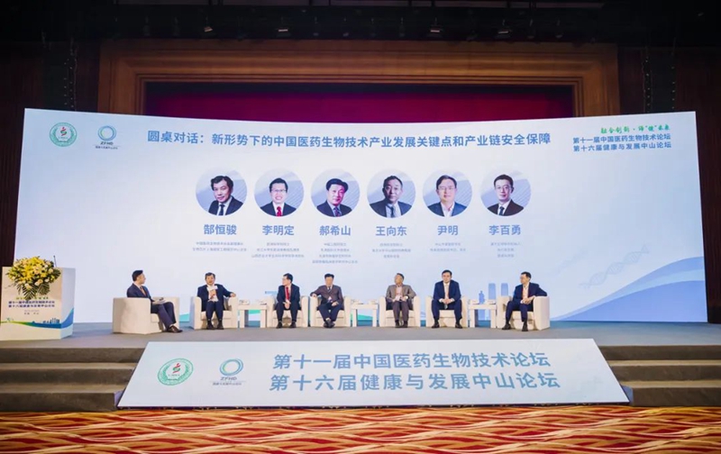在圓桌對話環節,中國工程院院士、天津醫科大學原校長、天津市腫瘤研究所所長、國家腫瘤臨床醫學研究中心主任郝希山,歐洲科學院院士、復旦大學中山醫院特聘教授、首席科學家王向東,歐洲科學院外籍院士、浙江大學求是講席教授及博導、山西農業大學生命科學學院學術院長李明定,中山市委副秘書長、發改局局長尹明,中國醫藥生物技術協會副理事長、生物芯片上海國家工程研究中心主任郜恒駿,康方生物聯合創始人、執行副總裁、首席科學官李百勇等行業專家和企業家齊聚一堂,圍繞“新形勢下中國醫藥生物技術產業發展關鍵點和產業鏈安全保障”主題進行了探討,并就“ ‘黃金內灣’健康產業發展新機遇”等議題分享了精彩的觀點與思考。