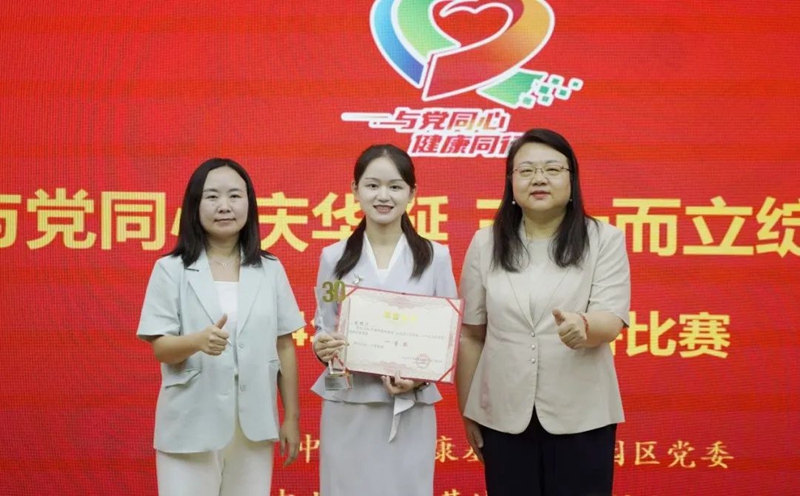 中山港街道團工委書記高穎與健康基地集團園區黨委書記、總經理萬鶴群為一等獎獲得者胡雅文(行政部)頒獎