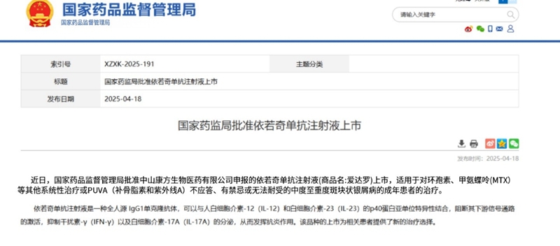 依若奇單抗關鍵注冊研究牽頭人、北京大學人民醫院張建中教授表示:“非常欣慰,依若奇單抗開啟了IL-12/IL-23單抗的國產化新時代。多項臨床研究顯示,依若奇單抗具有良好的療效和優異的安全性,短期療效顯著,長期可穩定維持,改善皮損的同時有效提高患者生活質量。依若奇單抗給藥頻次少,每年僅需4次,有助于提高患者的用藥依從性,進而長期穩定的提升治療效果和生活質量。作為臨床醫生,我們相信依若奇單抗的獲批上市,能夠為廣大患者提供更為便捷、可及性更強,更為高效且耐受性更佳的治療新選擇。”
