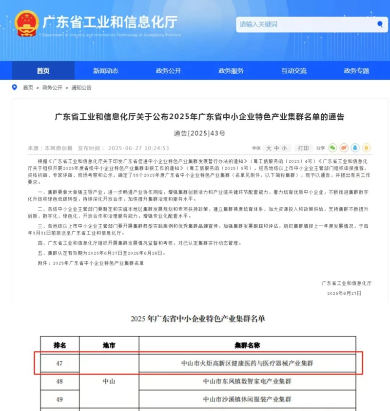 近日,廣東省工業和信息化廳正式發布《廣東省工業和信息化廳關于公布2025年廣東省中小企業特色產業集群名單的通告》。其中,中山火炬高新區健康醫藥與醫療器械產業集群成功入選。