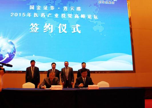 10日 ,考察組一行參加了2015年醫藥產業投資高峰論壇。在論壇上,侯奕斌書記與連云港市委常委、連云港開發區黨工委書記關永健就中山火炬開發區與連云港開發區達成戰略合作進行簽約,兩區明確將在醫藥產業集群、品牌推廣、信息技術、金融、貿易等領域展開深入的交流與合作。