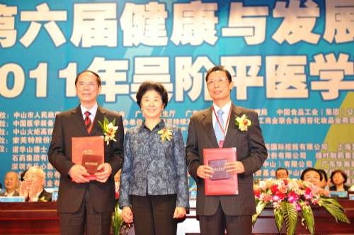 【大公報(bào)訊】中新社中山19日消息:中國(guó)醫(yī)學(xué)界最高規(guī)格的個(gè)人獎(jiǎng)項(xiàng)──吳階平醫(yī)學(xué)獎(jiǎng)今天在廣東中山市舉行頒獎(jiǎng)大會(huì),鍾南山院士、韓濟(jì)生院士獲得2011年吳階平醫(yī)學(xué)獎(jiǎng)。全國(guó)政協(xié)副主席、中科院院士、吳階平醫(yī)學(xué)獎(jiǎng)評(píng)委王志珍向兩位獲獎(jiǎng)?wù)哳C發(fā)了獲獎(jiǎng)證書(shū)和獎(jiǎng)?wù)隆?